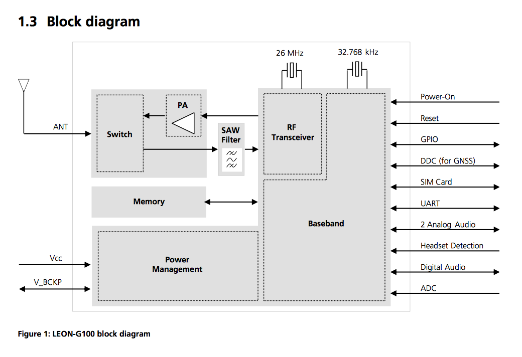 LEON-G1 series modules are cost efficient solutions offering full quad-band GSM / GPRS data and voice functionality in a compact LCC (Leadless Chip Carrier) form factor. Featuring low power consumption and GSM/GPRS class 10 data transmission with voice capability, LEON-G1 series modules combine baseband, RF transceiver, power management unit, and power amplifier in a single, easy-to-integrate solution.